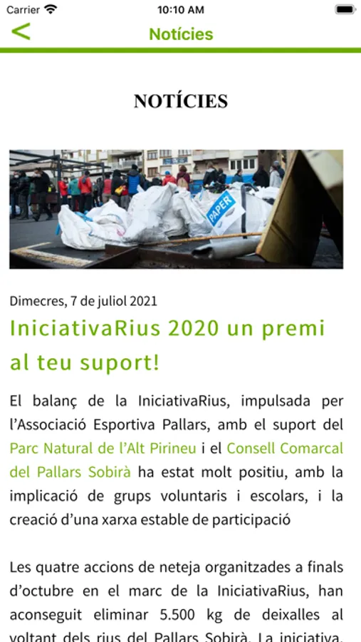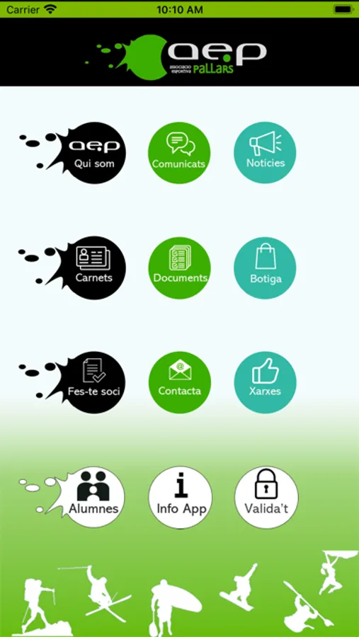 App de l'Associació Esportiva Pallars. L'aplicació permet una comunicació directa entre el centre i els usuaris. El menú consta amb diverses opcions: qui som, comunicats, notícies, carnets, documents, botiga, fes-te soci, contacta, xarxes. A la barra inferior hi ha la secció Alumnes, Info App i Valida't.