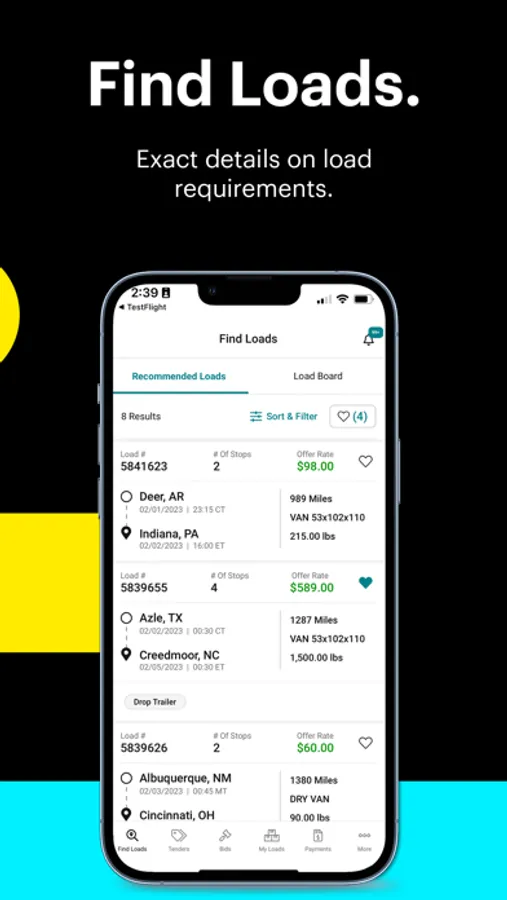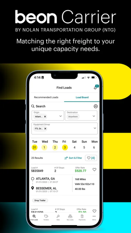 Beon Carrier’s load board allows you to sort and filter available freight to easily find loads that match your needs. You can view all relevant load details so you know exactly what each shipment requires. Submit a bid on a load and if the price is right -- book it right on the spot with a single click.