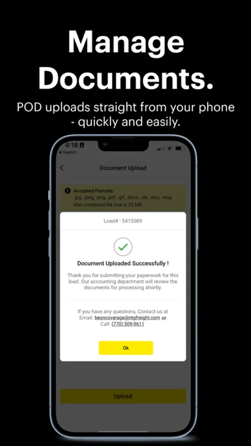 Just delivered your load and need to submit the POD? Now you can easily upload documents directly through the Beon Carrier App. The upload feature allows you to take a picture or choose from a recently taken photo. Documents will be uploaded directly, allowing your shipments and accessorials to be processed in a timely fashion.
