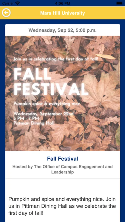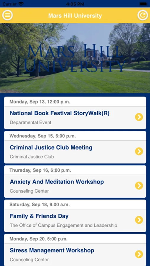 Use the Mars Hill University Events app to find out what events are happening and find out how you can get involved on campus!