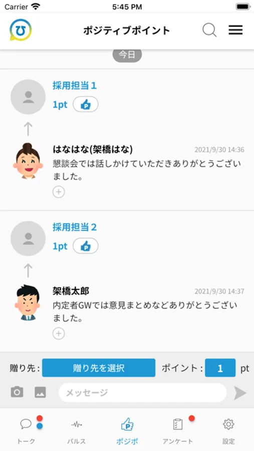 内定者ひろば内のコメントに対し「いいね」や賞賛スタンプ等で反応したり、感謝の気持ちをポイントとして付与しあえる機能です。積極的に称賛をすることで、同期同士の横の繋がりの強化、入社意欲の向上に活用することができます。