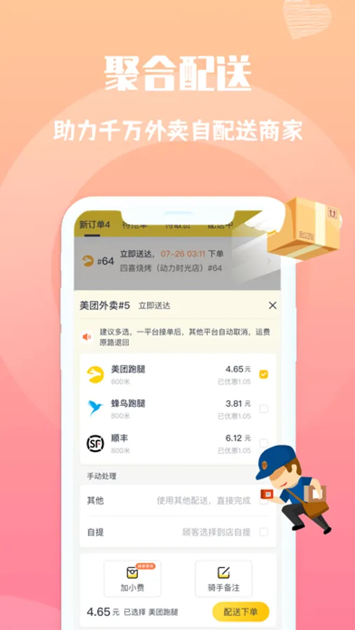 [一键发单]可自主绑定商家自有的美团跑腿、蜂鸟跑腿、顺丰同城、达达快送,闪送、UU跑腿等配送账号,实现闲时比价发单,运力紧张时多平台同时呼叫;