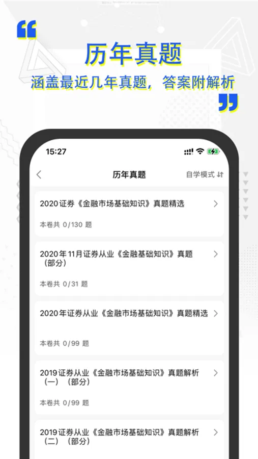 证券从业资格证一款随时随地可用的智能高效刷题软件。考生可通过设置备考目标,快速开启高效提分计划。同时我们拥有超大型在线题库,证券从业对题库是一个帮助用户高效学习,成就职业梦想的在线学习平台。