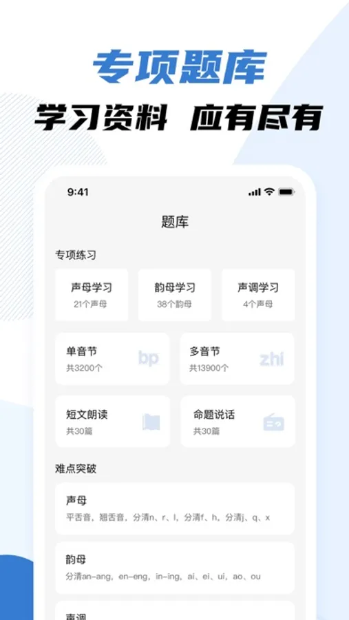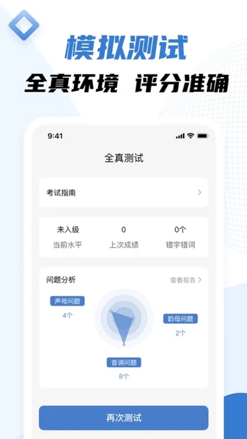 模拟普通话水平考试真实的场景及出题电脑界面,还原试题难度,提前考几次熟悉后更能出满分,测试结果精准。