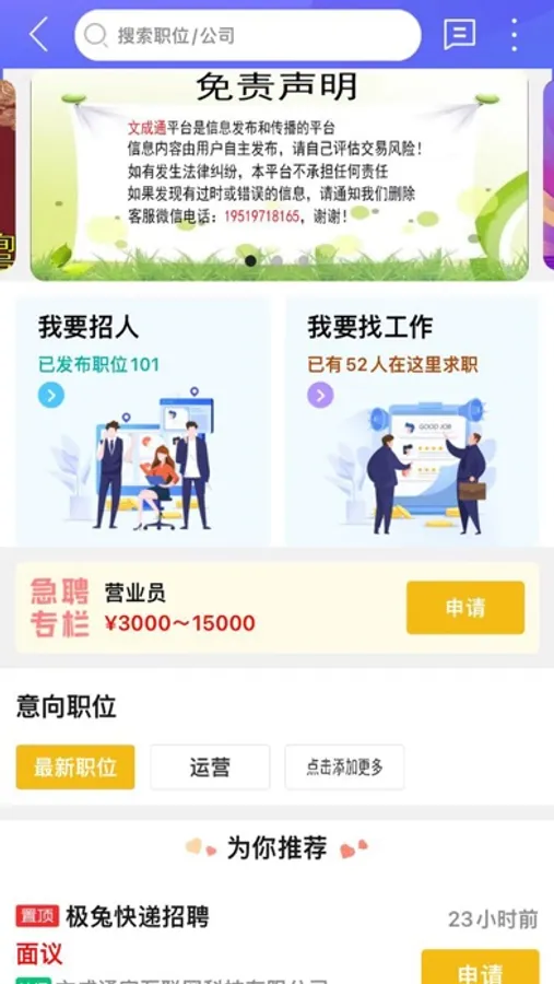 文成通创实互联网科技有限公司是为文成人民的生产、生活和消费带来信息化便利目的的网站平台。文成通网站是一个涉及文成本地商家名片信息、事业单位名片信息、招聘求职信息、房屋租赁信息、闲置物品信息、跑腿外卖服务、新闻娱乐信息、征婚交友信息等多方面功能。在文成通网站上文成人民能找到解决自己麻烦联系方式、寻找适宜的住房、理想的工作、闲置物品的额外收益、外卖和购物的便利或者找到志趣相投的爱人和朋友等各方面用途。