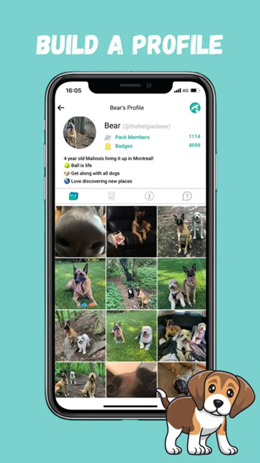 Build your dog a personalized social profile. Creating a profile allows you to build a pack with your doggo friends. You can share photos, send messages, and share fun facts about your dog with friends.