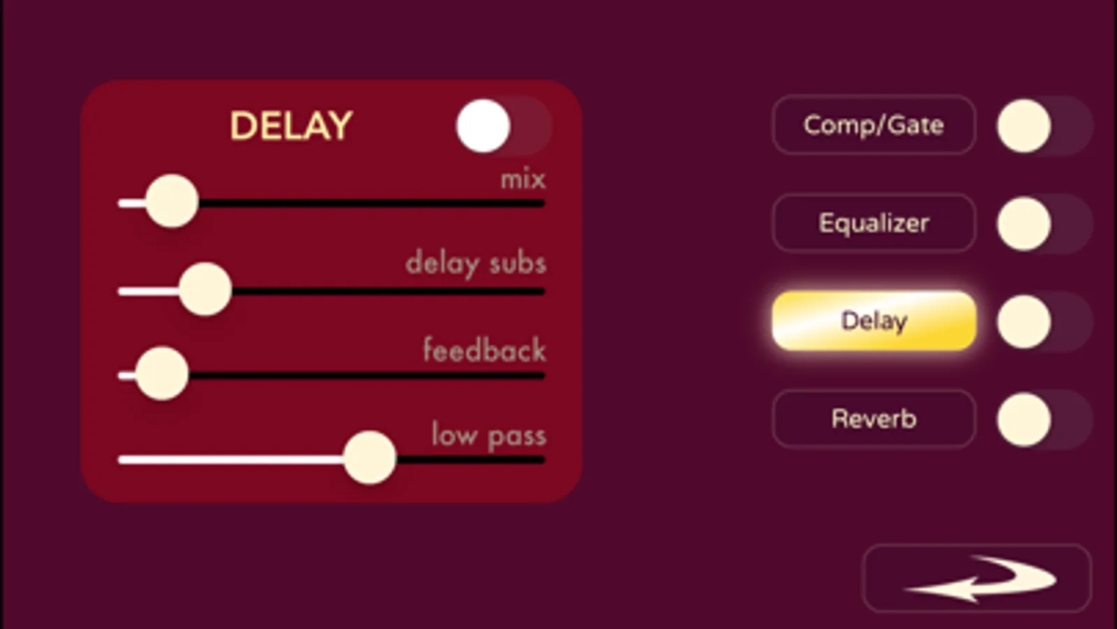 - 4 Effects: Compressor, Equalizer, Delay, Reverb.