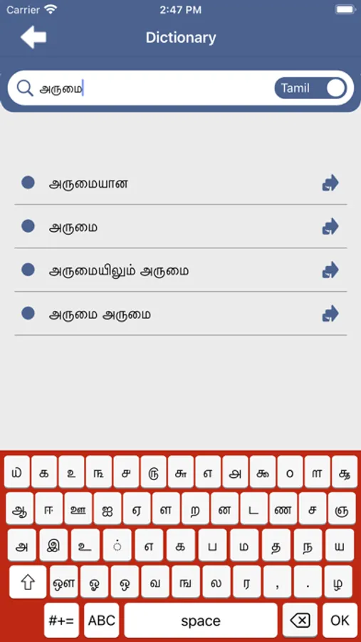 - Use the language button to switch between English and Tamil. English word suggestions are also available.