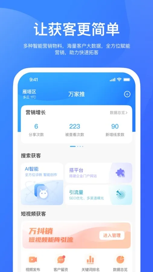万家推云平台app致力于以前沿性互联网技术为企业转型升级,以数字化传播矩阵为企业营销赋能,以专业化内容服务为企业引流拓客,助力企业改变传统营销模式,帮助企业提升流量转化,实现业务增长。