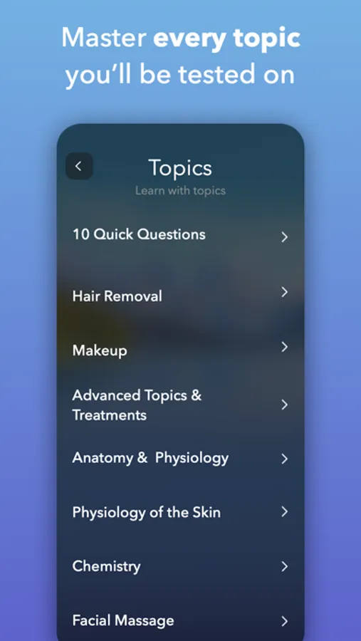 You will see why this app is referred to as "The Esthetician Bible" - It's so comprehensive! It will teach you everything you need to pass your exam.