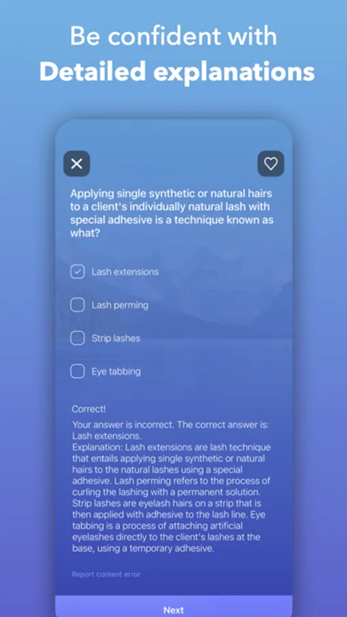 Swipe the cards to quickly review Esthetician concepts without the need to go through the whole test, complete the right amount of questions for you, and get some quick studying in.