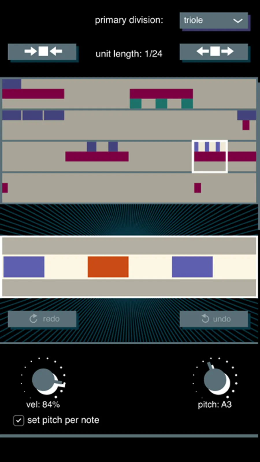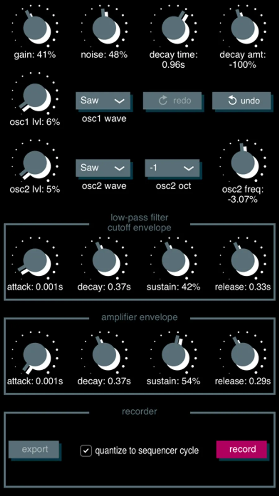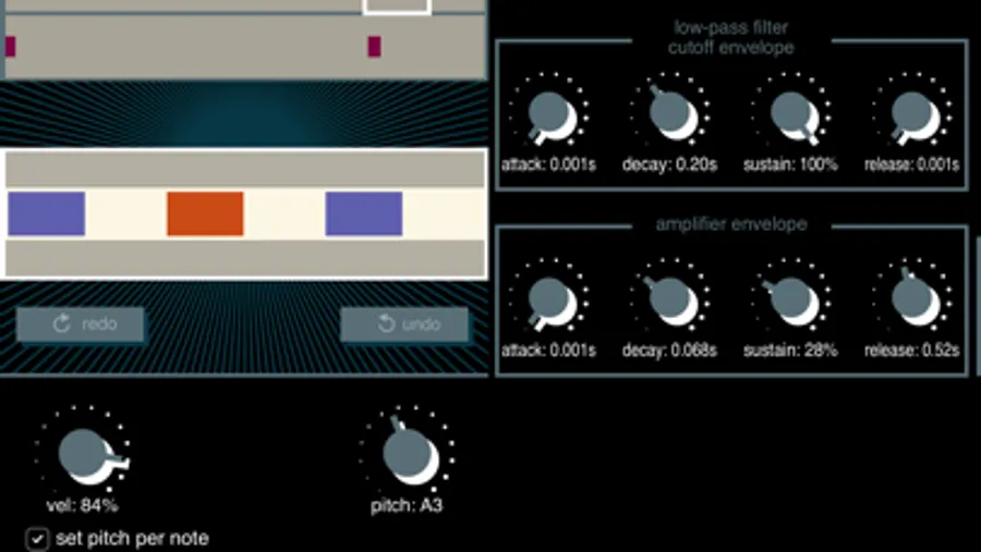 A rhythm or a melody can be created using the sequencer. Tap notes into one of the four tracks, one track for each voice of the synthesizer. Set note's pitch and velocity using knobs. Or don't, and rely on a global track's pitch setting.