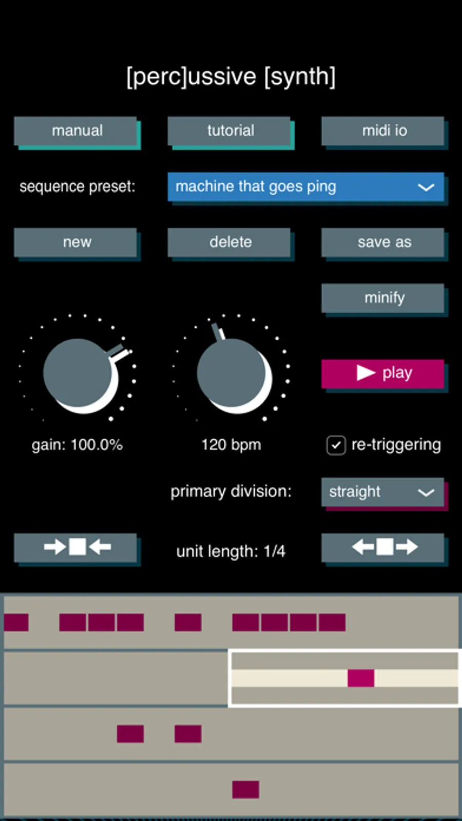 Percussive synth will accompany you while you jam, be your groove experimentation space, or be your source of recording material you may export and mix in a DAW.