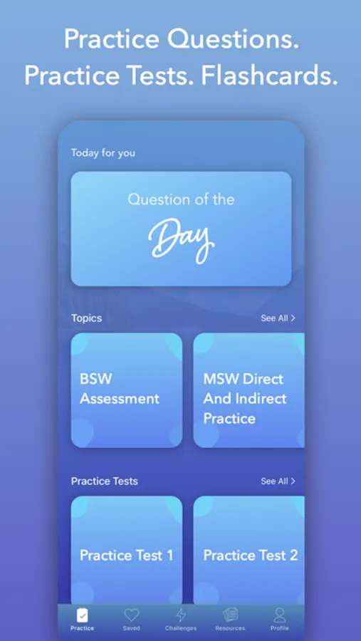 Swipe the cards to quickly review ASWB concepts without the need to go through the whole test, complete the right amount of questions for you, and get some quick studying in.