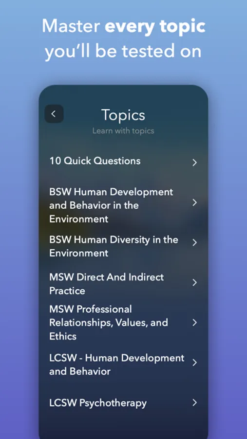 You will see why this app is referred to as "The ASWB Bible" - It's so comprehensive! It will teach you everything you need to pass your exam.