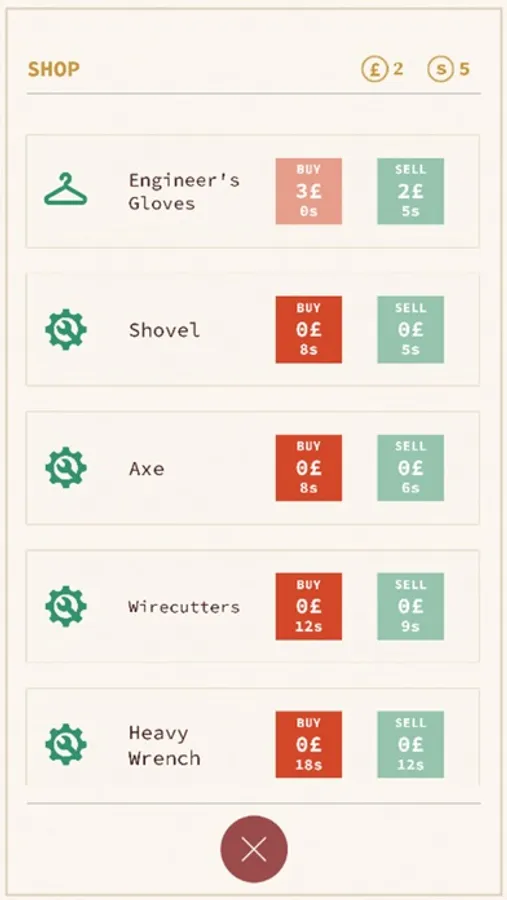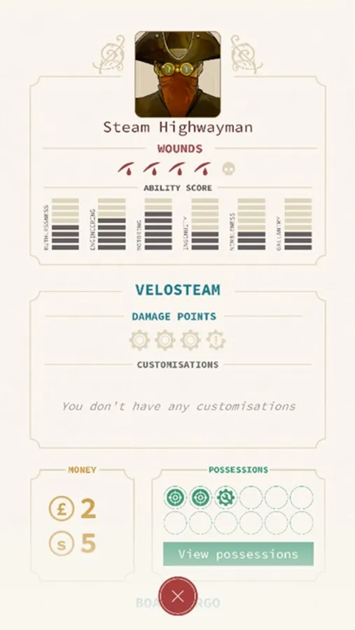 * Character sheet to manage your inventory, your money, the heavy Ferguson velosteam and your boat