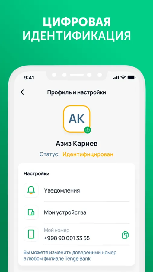 - Цифровая идентификация. Вы можете стать клиентом Tenge Bank не посещая, наши отделения.