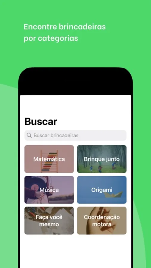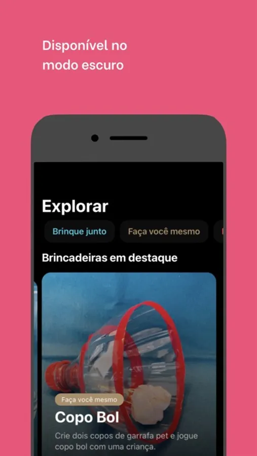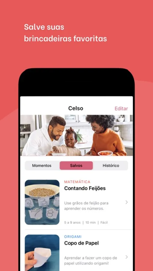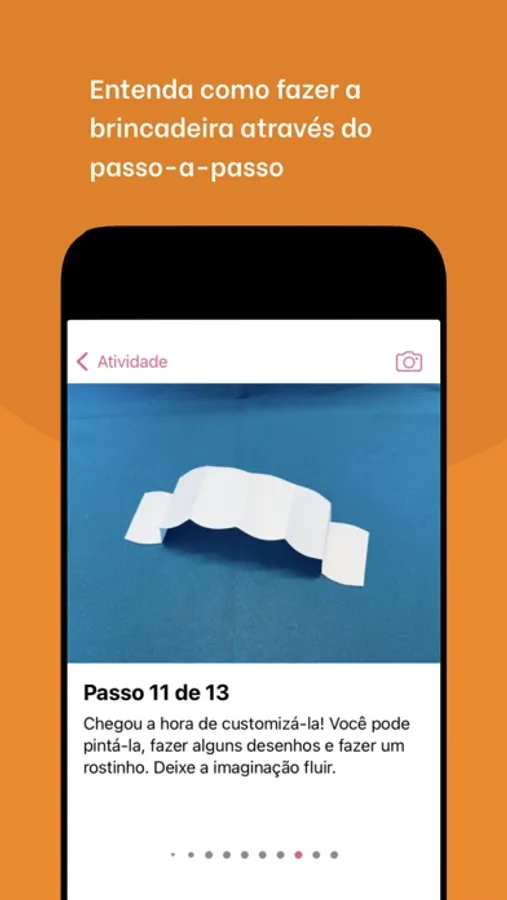 O App recomenda atividades de temas variados contendo informações sobre dificuldade, duração mínima de tempo e faixa etária sugerida, com uma breve introdução sobre a brincadeira escolhida. Ao tocar em “Comece a brincar”, você vê uma série de passos escritos de maneira didática com imagens explicativas sobre a atividade. Basta clicar no botão de câmera para registrar esses “momentos” no seu perfil.