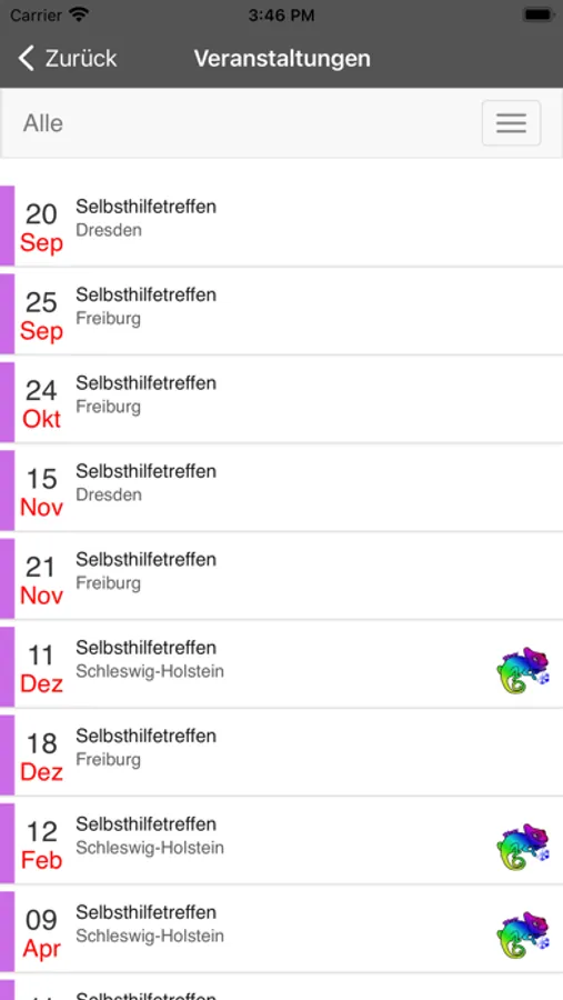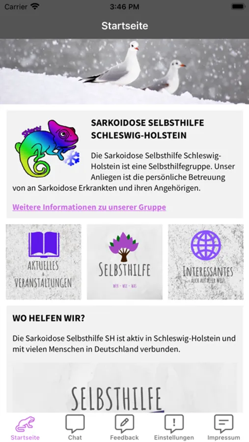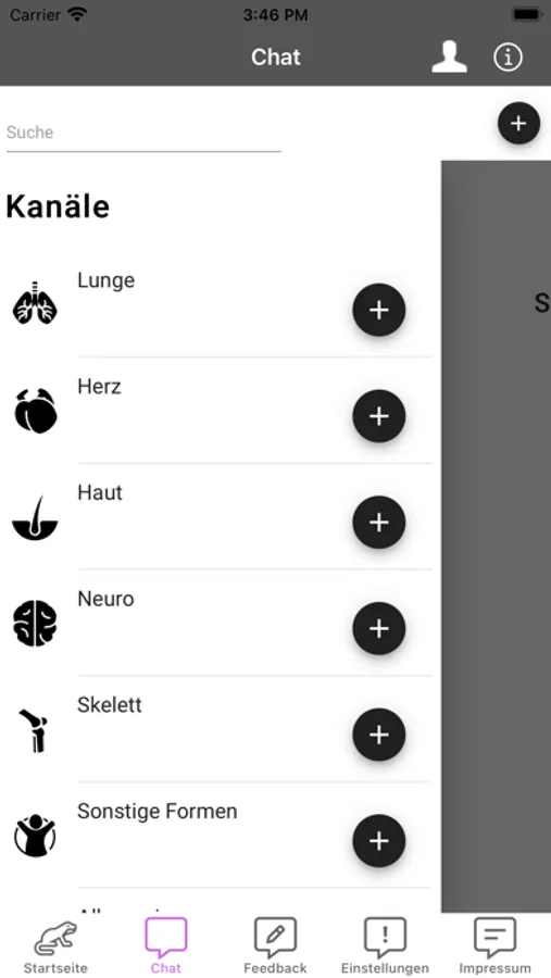 Ein Chat, aufgeteilt in die wichtigsten Bereiche, rundet diese App ab und ermöglicht den datenschutzkonformen Austausch unter Betroffenen.