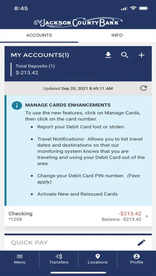 Jackson County Bank’s Mobile App allows for External Transfers (A2A), Person to Person Payments (P2P), and Mobile Check Deposits using your device’s camera.