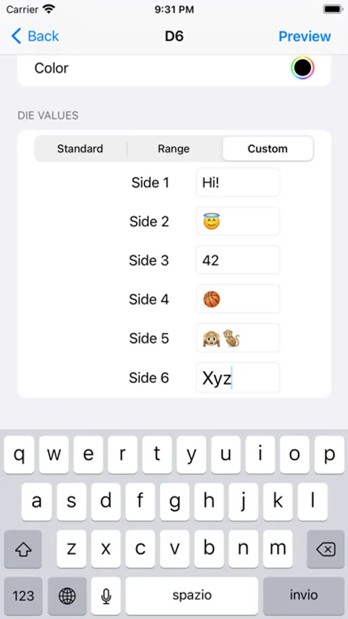 For a new die, select the geometry (from 4 to 30 faces), the color and the numerical values associated with the faces; for example, for a 12-sided die you can select the standard sequence (face values from 1 to 12) or any range from 0 to 99 (ex: with a range from 2 to 24, the faces will contain the sequence of the first twelve even numbers). Finally, you can associate a specific value or text (including emoji) to each face for complete customisation.