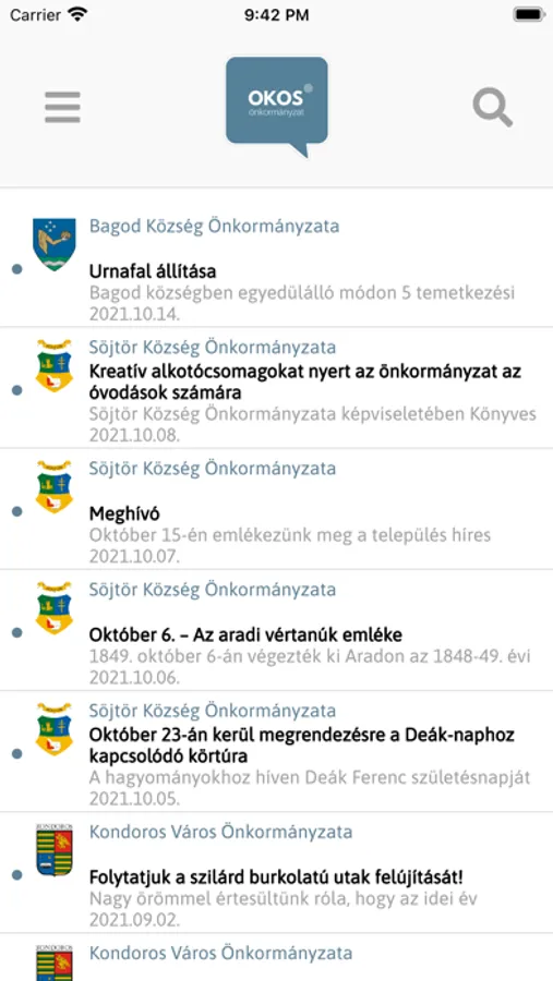 Az értesítések mellett megjelenik az önkormányzat címere is és a címert kiválasztva lekérdezhető az adott önkormányzat valamennyi értesítése, azaz egy önkormányzatnak saját oldala, hírfolyama van.