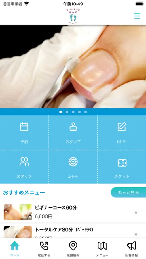 【足と爪の専門店ばんの】の公式アプリが登場。アプリを通して【足と爪の専門店ばんの】の新着情報やお得な情報をリアルタイムで受け取ることができます。また、いつでもお手元のスマートフォンから、メニューやご希望のお時間帯のチェック・ご予約などが可能です。アプリをインストールしていただくことにより【足と爪の専門店ばんの】を、より便利に身近にご利用していただけます。