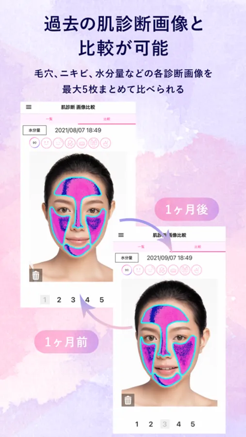 肌診断スコアの推移をグラフ化や肌診断画像と比較も可能です。