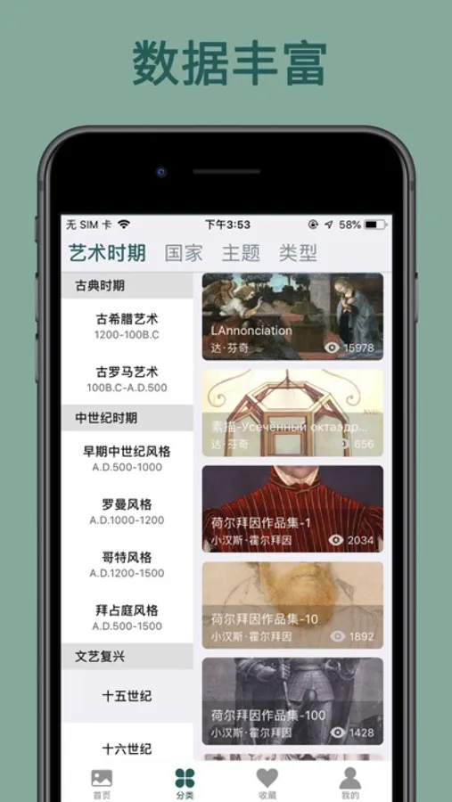我们收集了古今中外的海量极品艺术品图像资料,清晰无暇,色彩准确,而且对作品按艺术时期、国家、主题和类型做了清晰的分类。