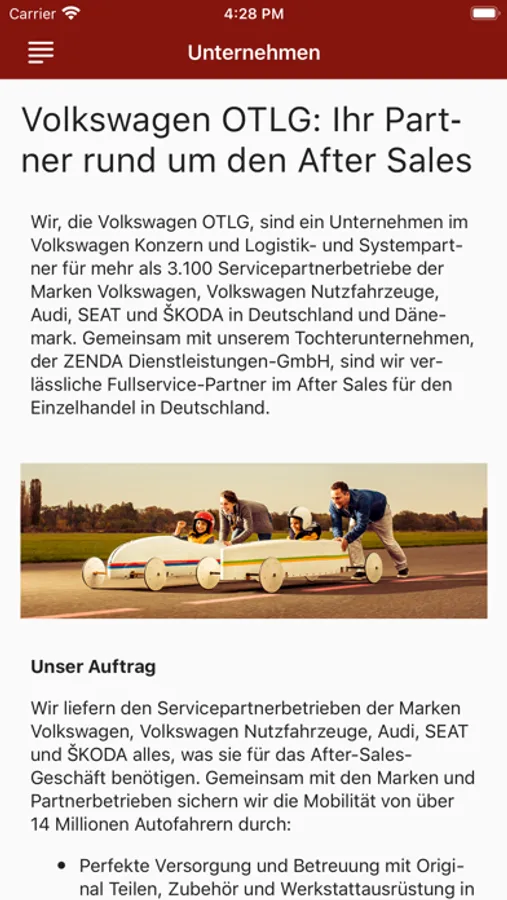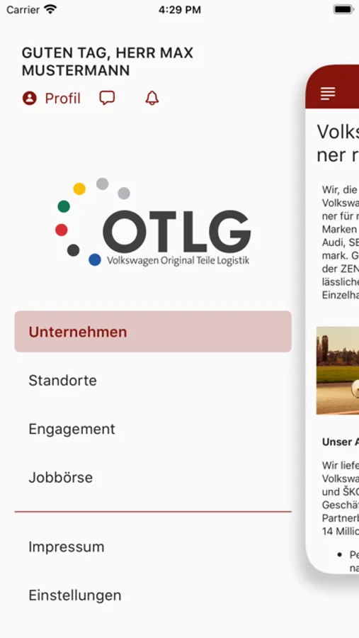 Erhalte Einblick in die OTLG Welt. Hier erfährst du nicht nur spannende Dinge über uns, die Volkswagen OTLG. In der App MeineOTLG erhältst du außerdem aktuelle Nachrichten direkt aus dem Unternehmen, erfährst Interessantes über eine Karriere bei uns und hast Zugriff auf unsere Stellenanzeigen.