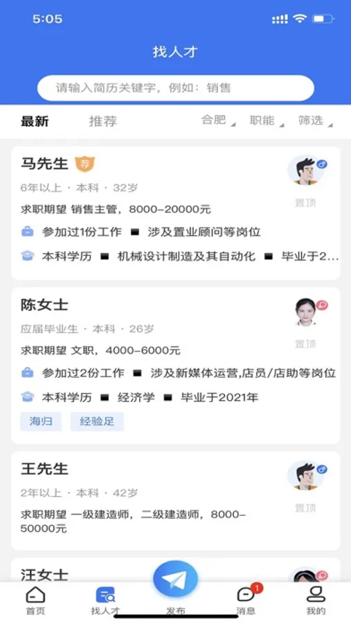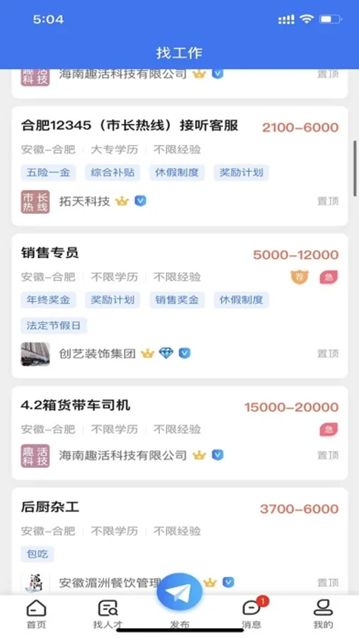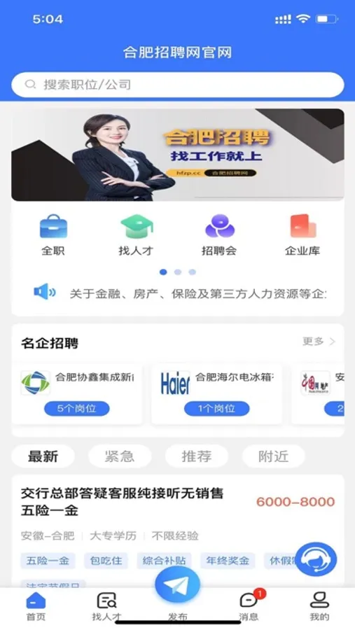 企业找人才招聘,人才找工作求职,合肥招聘网(www.hfzp.cc)!为求职者免费提供更全更新的招聘信息,为企业免费提供线上线下招聘、校园招聘、人才网人才交流会招聘等一站式专业人力资源服务,智联同城直聘。