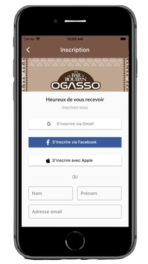Pour pouvoir utiliser l’application Ogasso il faut créer un compte utilisateur. La procédure de création de compte utilisateur est très simple. En disposant déjà d’un compte Gmail ou Facebook, il est possible de s’inscrire en un clic. Dans le cas contraire, il est nécessaire de remplir les quelques champs du formulaire d’inscription.