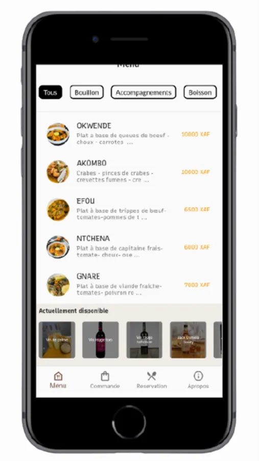 La rubrique Menu de l’application présente la liste des produits de Ogasso. Cette liste peut être filtrée par catégorie de produits (Bouillon, Accompagnement, Boisson).