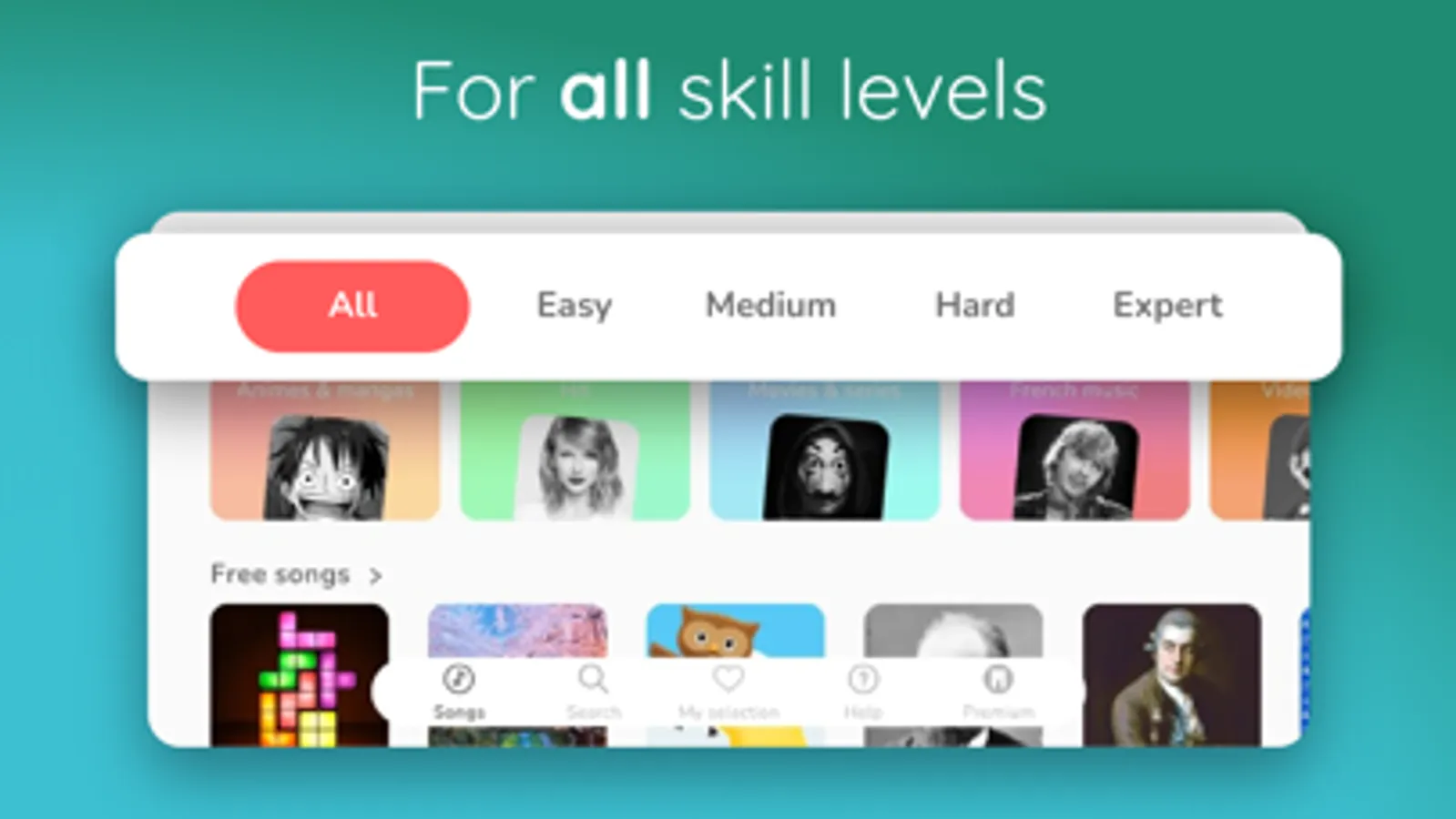 - More than 3000 songs of all genres (rock, jazz, movies & TV, classical music, anime & manga, cartoons, video games ...) and for all levels.