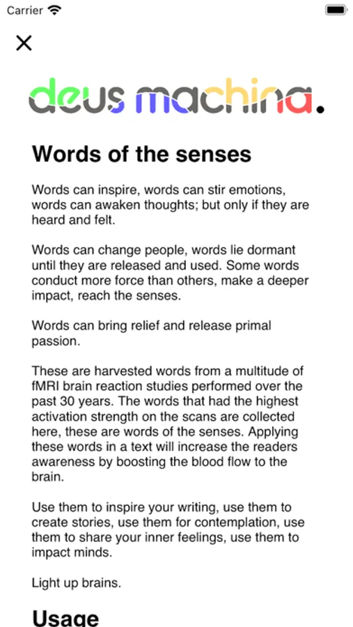 These are harvested words from a multitude of fMRI brain reaction studies performed over the past 30 years. The words that had the highest activation strength on the scans are collected here, these are words of the senses. Applying these words in a text will increase the readers awareness by boosting the blood flow to the brain.