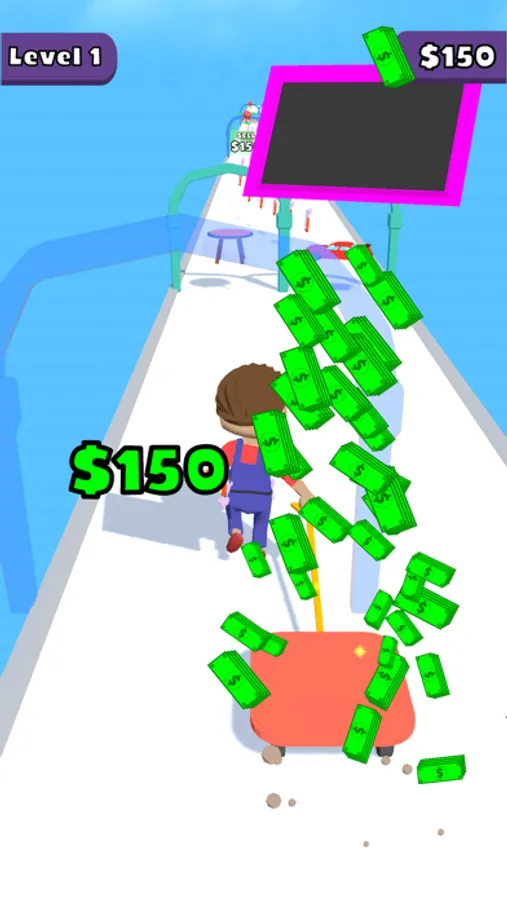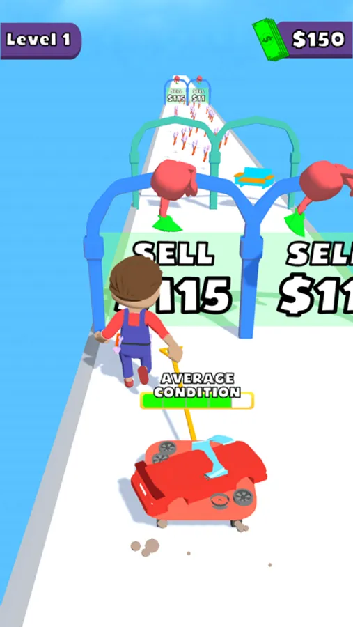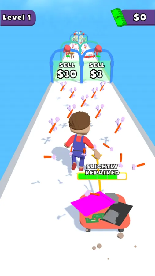 Repair items by collecting repair tools from the road, sell them by passing the sales gates and earn money.