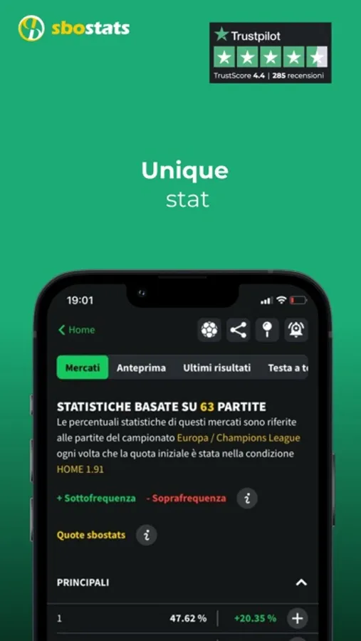 Sbostats is based on an efficient statistical/mathematical model. While it is a widespread belief that bookmakers look at team statistics to make their odds, Sbostats has observed their work, realizing that bookmakers use complex systems based on data not available, until now, to ordinary bettors. Sbostats has collected every single published odds on over one hundred different leagues, developing an innovative statistical system based on the historical odds.