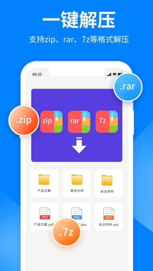 强大的解压软件,二十几种格式解压。微信/网盘文件直接解压、视频音频文档离线预览、大文件解压、分卷解压、加密解压、压缩包完整性检查。
