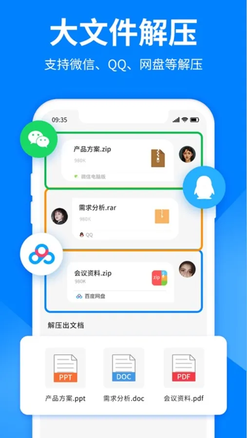 - 支持微信、在线网盘等应用直接导入解压;