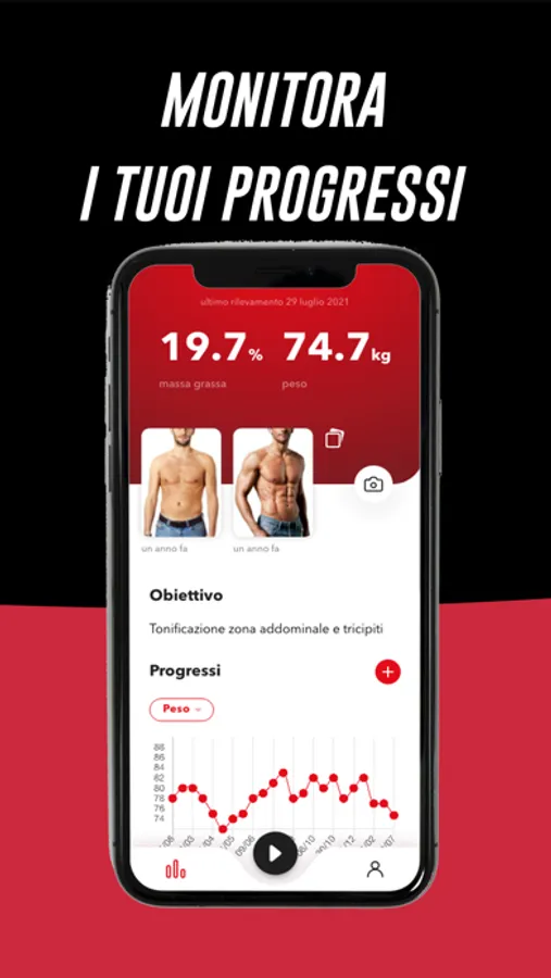 Avrai sempre sotto controllo la tua attività fisica: potrai visualizzare quali esercizi sono previsti nel tuo piano di allenamento, i tuoi progressi e come cambia il tuo fisico nel corso del tempo.
