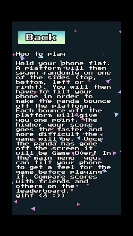 Bouncy Panda is a simple chill game which is all about hand control. As the points go up so does the speed of the panda meaning it will require less tilt input as the score gets higher. The game also has a leaderboard which displays the top 15 scores worldwide. In order to get your score added to the leaderboard you must set a name in the settings page. This game was created using the Godot engine and uses Silentwolf for its leaderboard services.