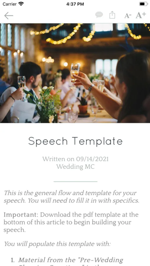 This tool will give you the speech template and guide, forms to build your speech, suggested content, pre-wedding preparation questions, hint's and tip's and much more to ensure you are ready to lead the reception and entertain guests.