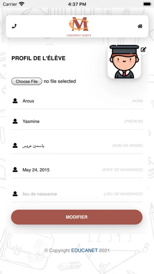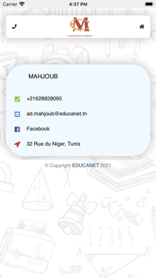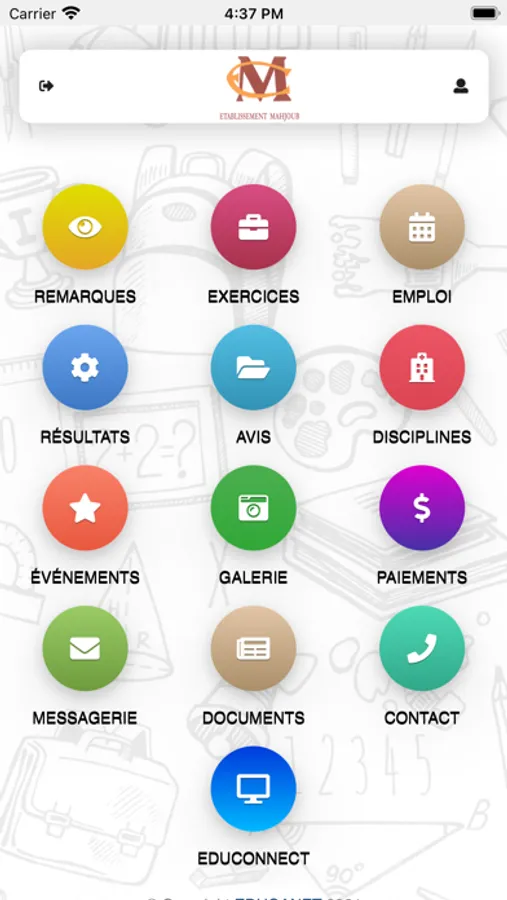 L'application ETABLISSEMENT MAHJOUB mobile permet au parent d'être à côté de son enfant: suivre les activités pédagogiques, recevoir des conseils du cadre de l'école, être à jour pour les évènements culturels et sportifs. Contacter l'administration de l'école, recevoir les bulletins des notes, ....ETABLISSEMENT MAHJOUB Mobile c'est être informé là où vous êtes... Cher parent ETABLISSEMENT MAHJOUB télécharger ETABLISSEMENT MAHJOUB Mobile et entrer votre identifiant et mot de passe disponible par sms ou à l'administration de l'école.