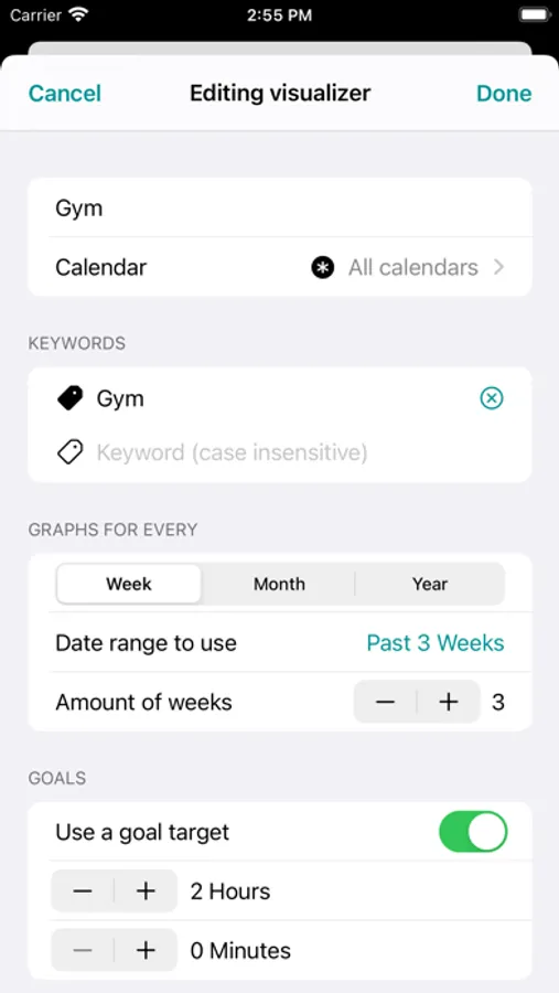 CalStats helps you get insights into your events, the way you want to. Want to know how much you go to the gym each week? No problem. How many hours have your spent on that one client? Just enter the keywords.