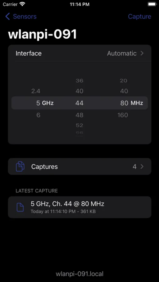 • Specify capture options: wireless interface, frequency band, channel, and channel width