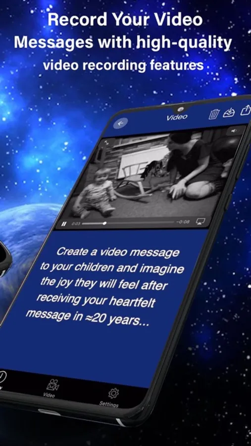 Our app will automatically send the video message at a selected time in the future. Your data is totally safe and we guarantee your privacy.