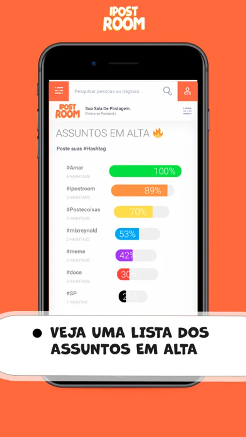 Veja uma lista de assuntos em alta com hashtag em IPostRoom.