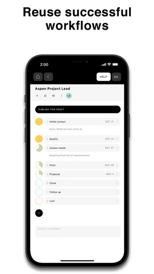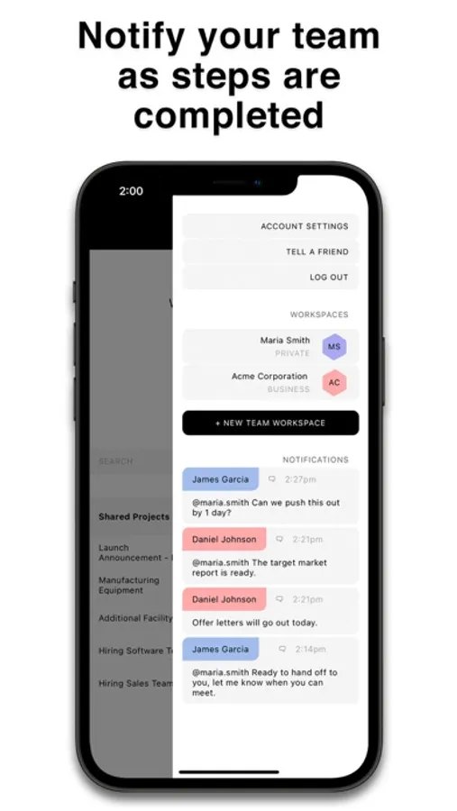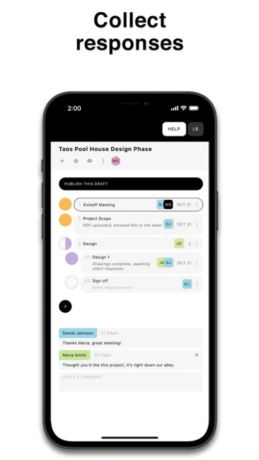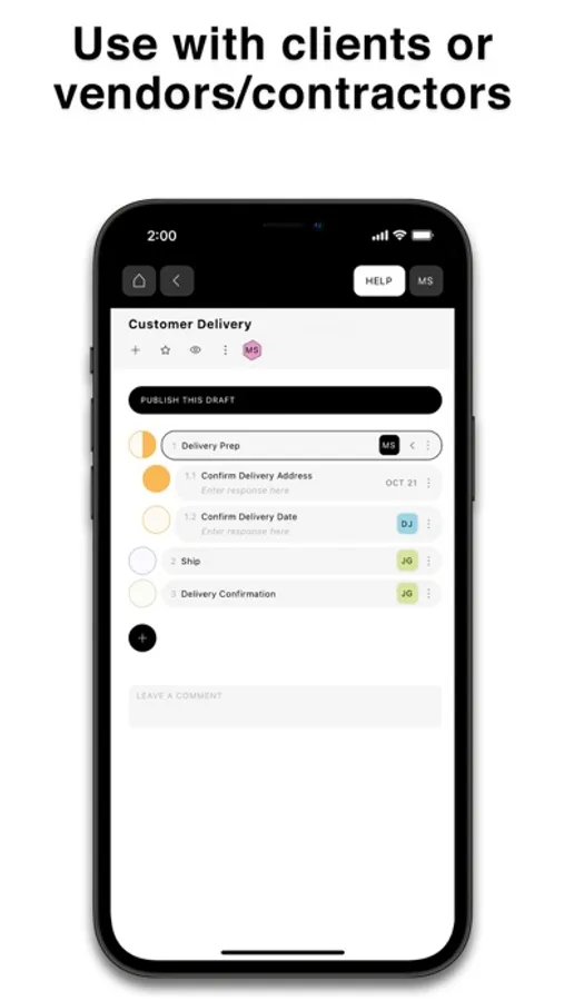 Share tasks with anyone, whether they have the app or not. This makes it great for things like guiding a potential client through a process of deciding to work with you, or coordinating a project with an outside consultant.