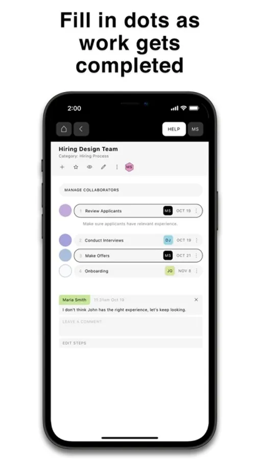 Dots represent steps in the process. As you fill in dots, collaborators get notified (if you wish).