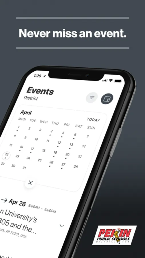 The event section shows a list of events throughout the district. Users can add an event to your calendar to share the event with friends and family with one tap.